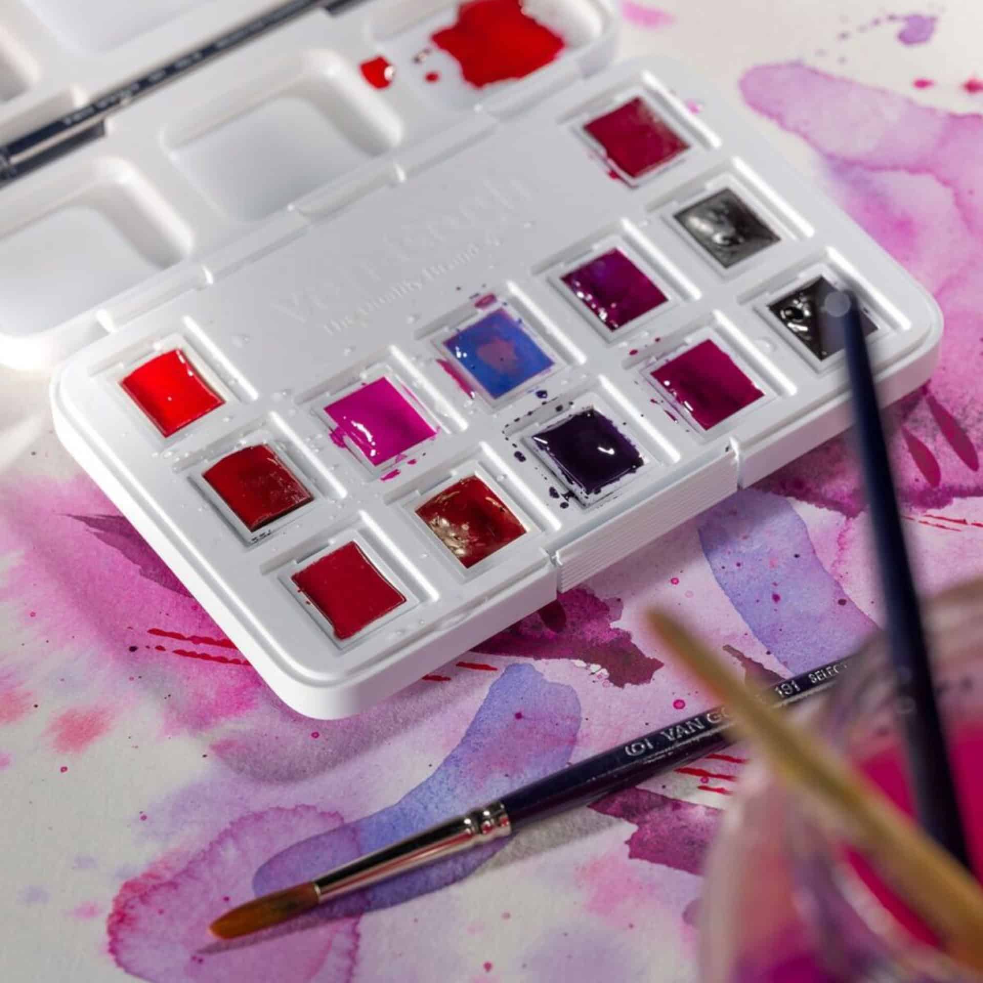 Gli acquerelli all’interno della confezione Box acquerelli Pink & Purple-van gogh sono noti per la loro trasparenza e la facilità con cui possono essere mescolati, permettendo all’artista di ottenere sfumature morbide e dettagli ricchi.
