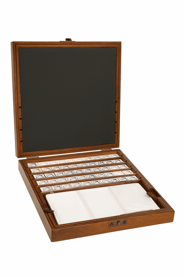 La confezione in legno racchiude 54 colori professionali e una tavolozza in ceramica.