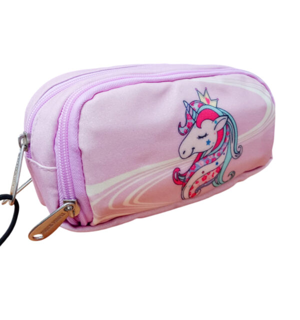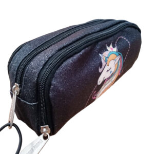 Questo splendido astuccio, pensato per le piccole amanti degli unicorni, si distingue per il suo tessuto glitterato rosa e un design luminoso e allegro che cattura subito l’attenzione.