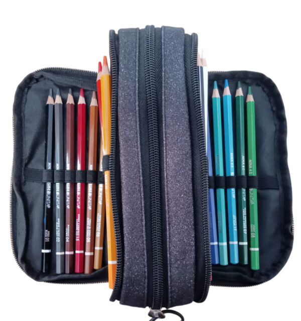 Dotato di tre comodi scomparti, l’astuccio offre ampio spazio per organizzare tutto il necessario.