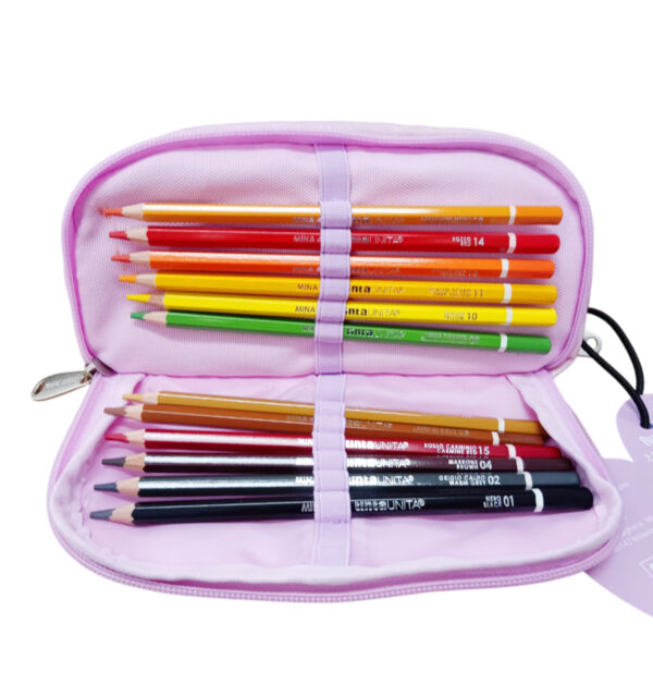 Le due tasche laterali sono attrezzate con passanti elastici che permettono di tenere perfettamente in ordine i 24 pastelli TintaUnita con mina da 4.0 mm già inclusi, ideali per disegnare e colorare in libertà.